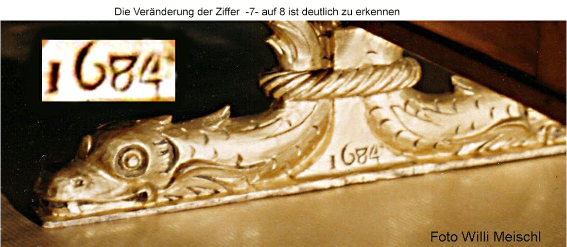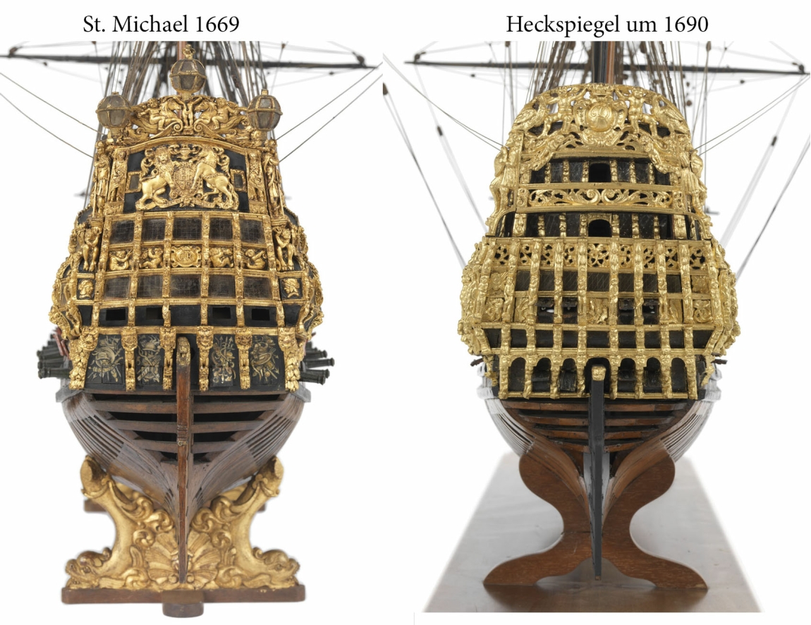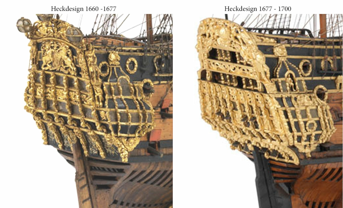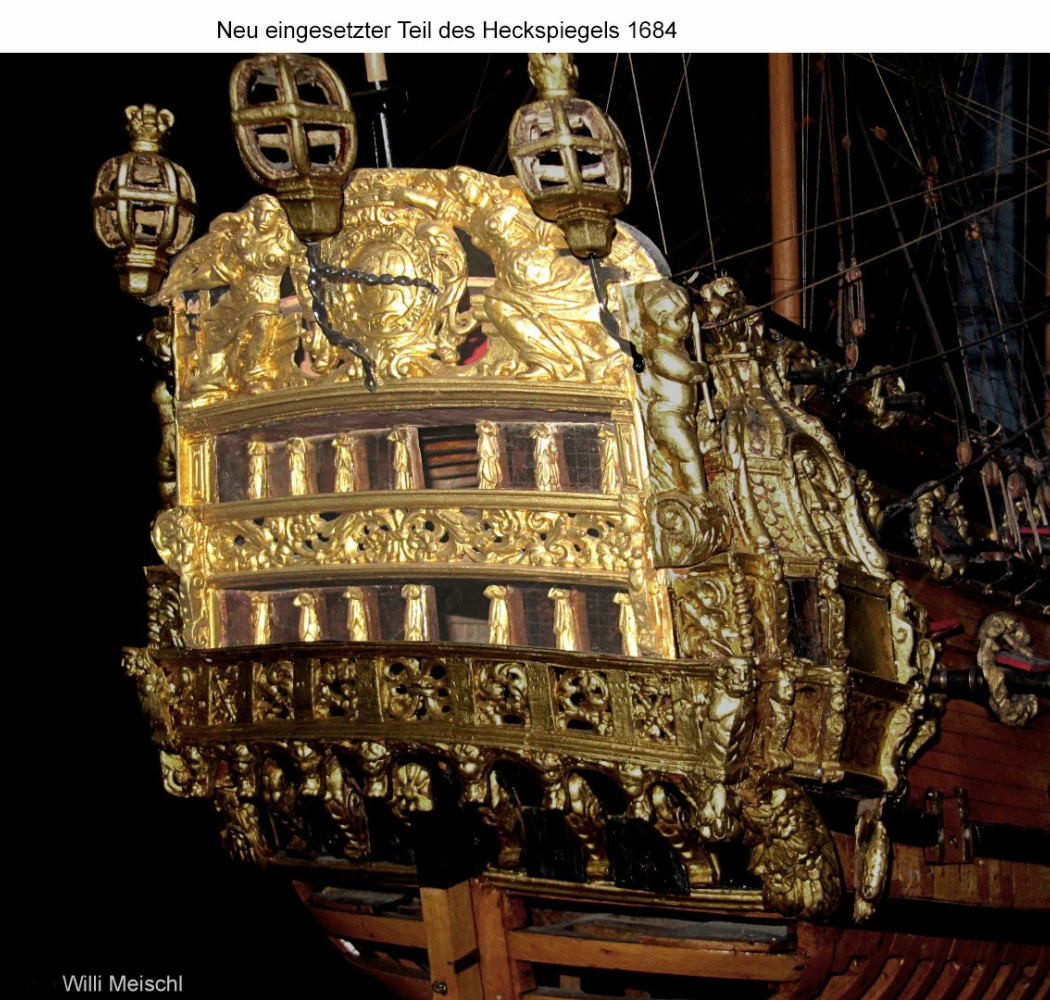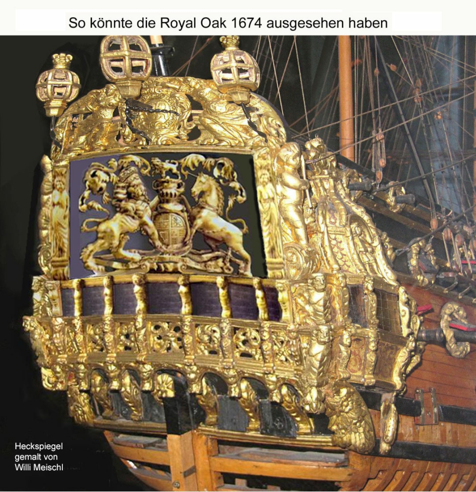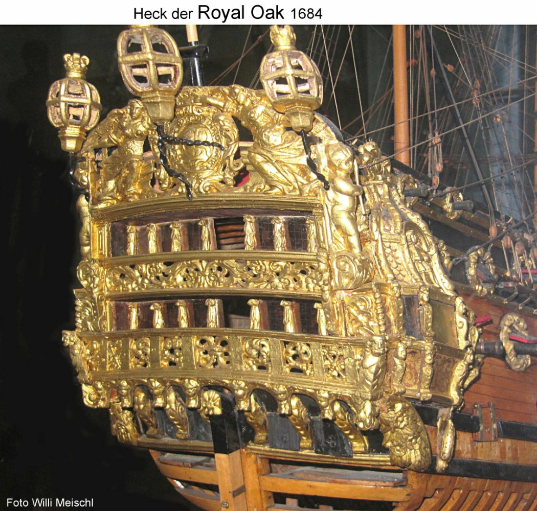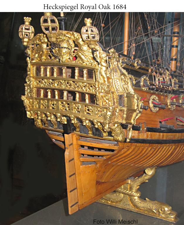 Heck Royal Oak 1674 Heckspiegel 1684 Neuer Heckspiegelteil 1684 Spiegel mit Stuart Wappen 1674 Veränderte Jahreszahl am Heckständer von 1674 auf 1684
